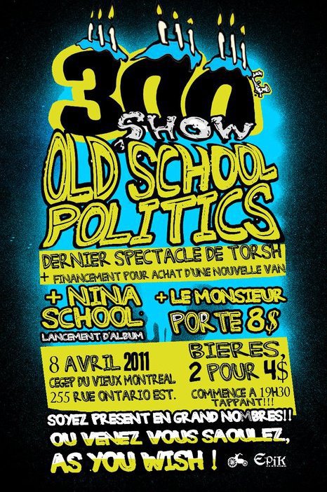 Old School Politics + Nina School ***À noter que c'est le dernier show de Torsh avec OSP + financement pour une nouvelle van! Rejoignez l'événement sur Facebook